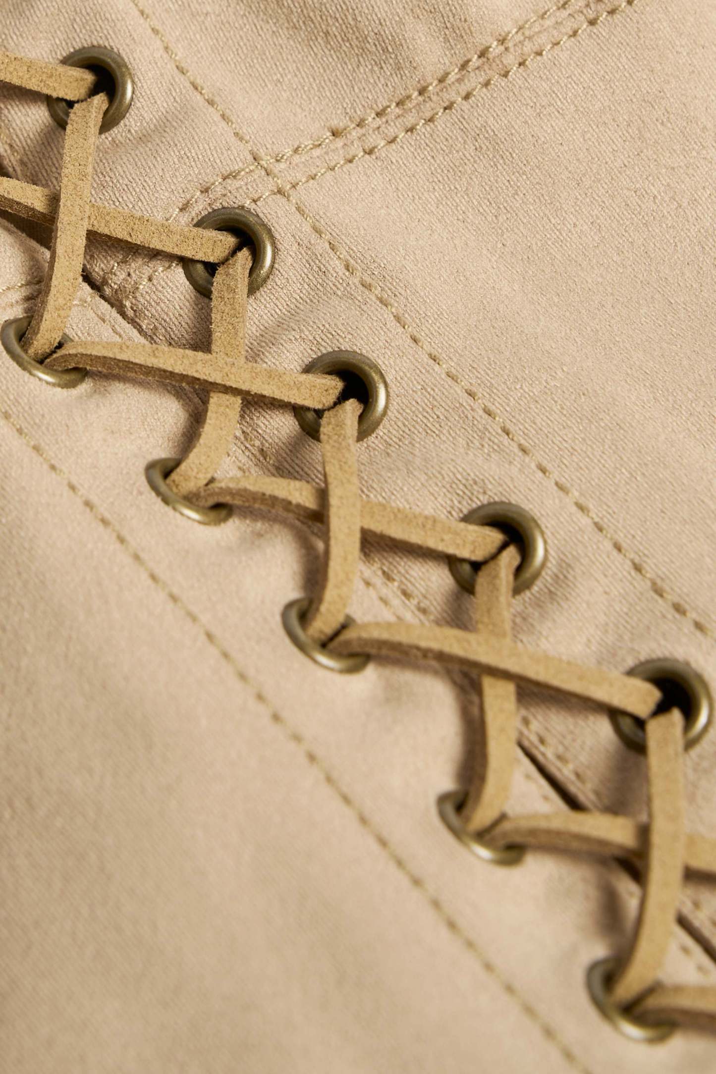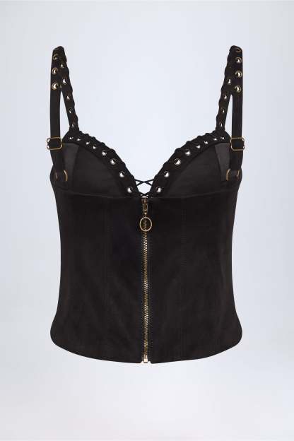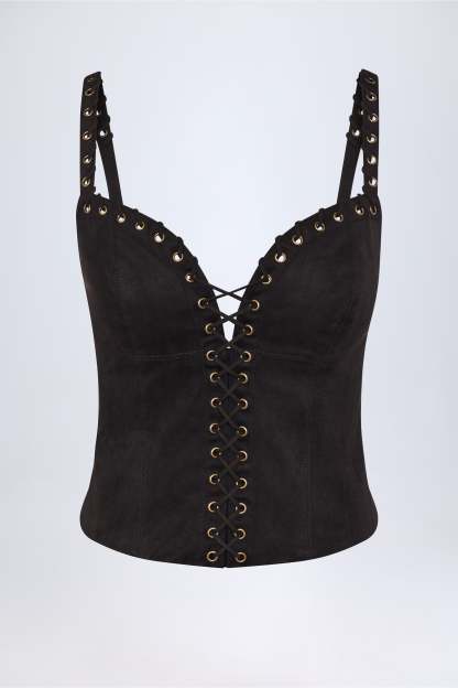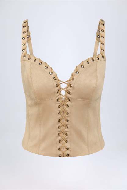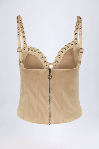 Country influences meet signature glamour with the Bela top. Crafted from soft-touch faux suede to a figure-hugging silhouette, it’s brought to life with tonal topstitching, decorative eyelets and contrasting lace-up details. It’s framed with a plunging neckline and features wide adjustable shoulder straps for a custom fit.