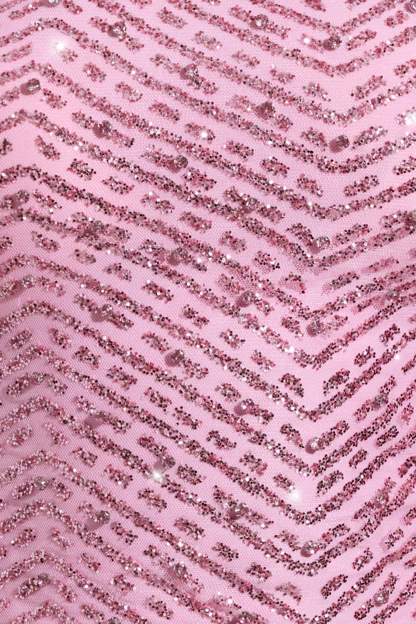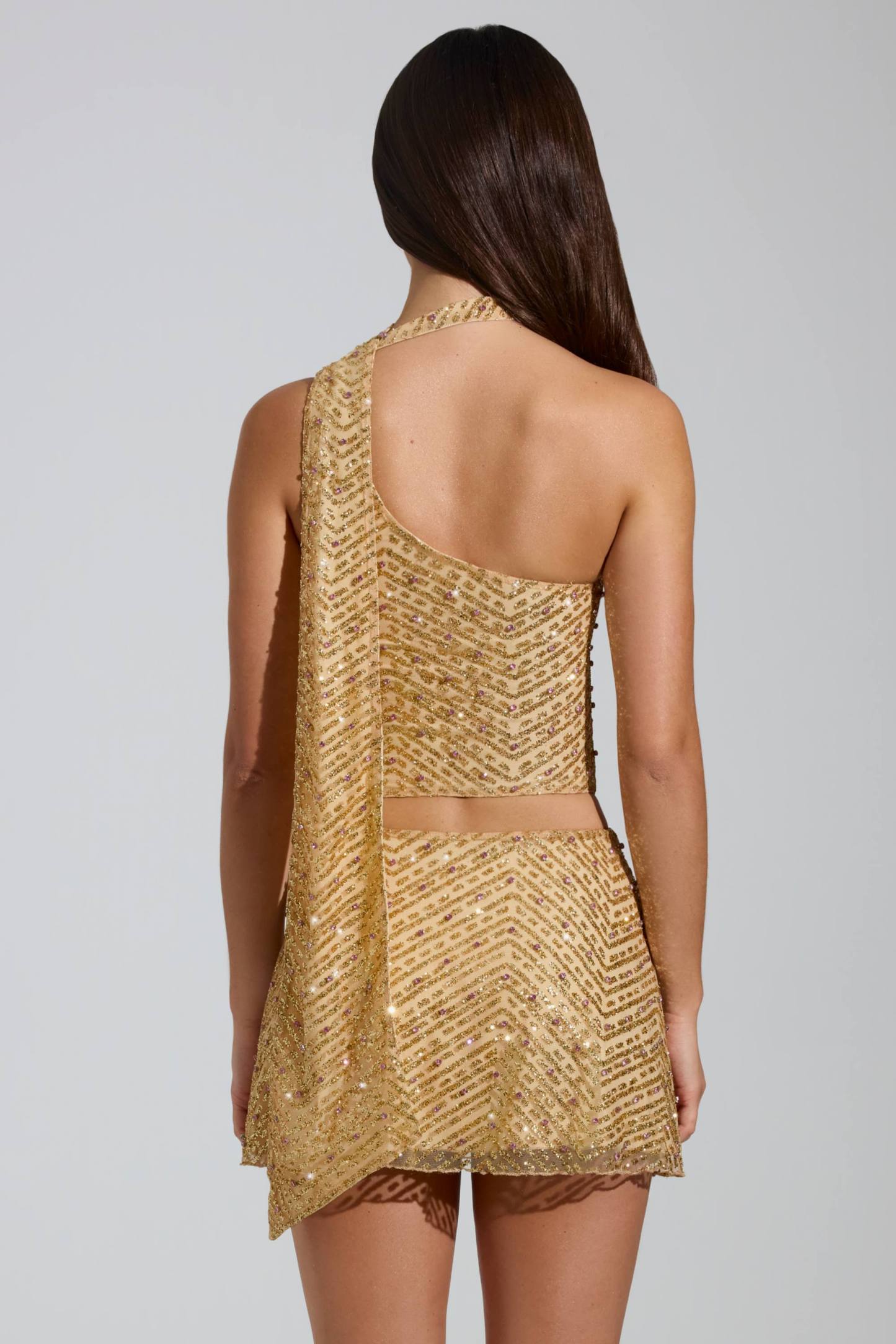 The Cosette top is designed to dazzle. Crafted from our premium lightweight glitter mesh, overlaid with three-dimensional beads and contrasting pink diamantés in a chevron pattern, it features a flattering asymmetrical neckline with an attached scarf, a cropped silhouette, and a concealed side zip for the perfect fit.