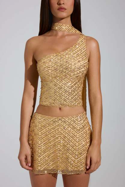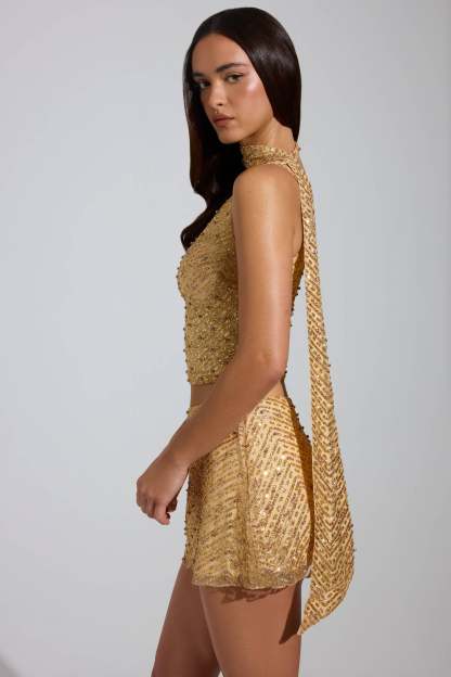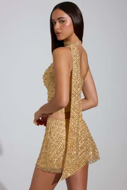 Embellished Scarf-Detail Asymmetric Top in Gold