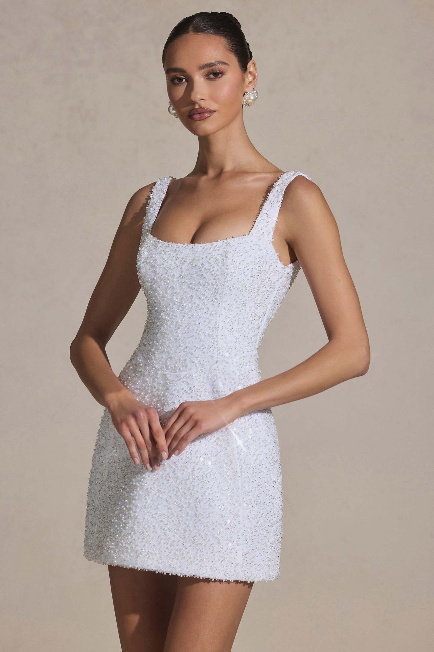 Showstopping silhouettes. Embellished with the prettiest pearl and bead embellishments, the Dominique mini dress is perfect for pre and post-wedding events. Crafted from lustrous recycled satin and premium mesh to a structured A-line silhouette, it’s elevated with a square neckline, tapered straps, and a cut-out back complete with adjustable lace-up detailing.