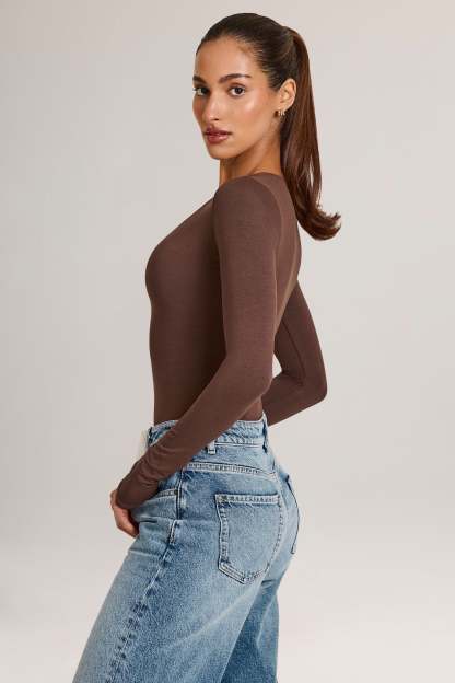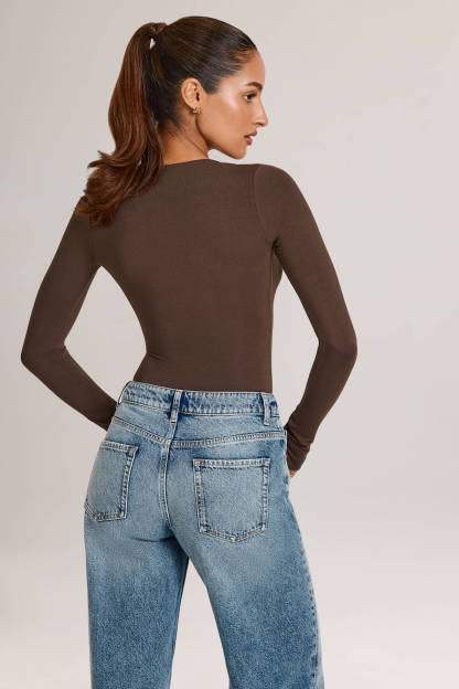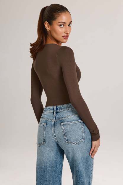 Modal Plunge Long-Sleeve Bodysuit in Chocolate Brown