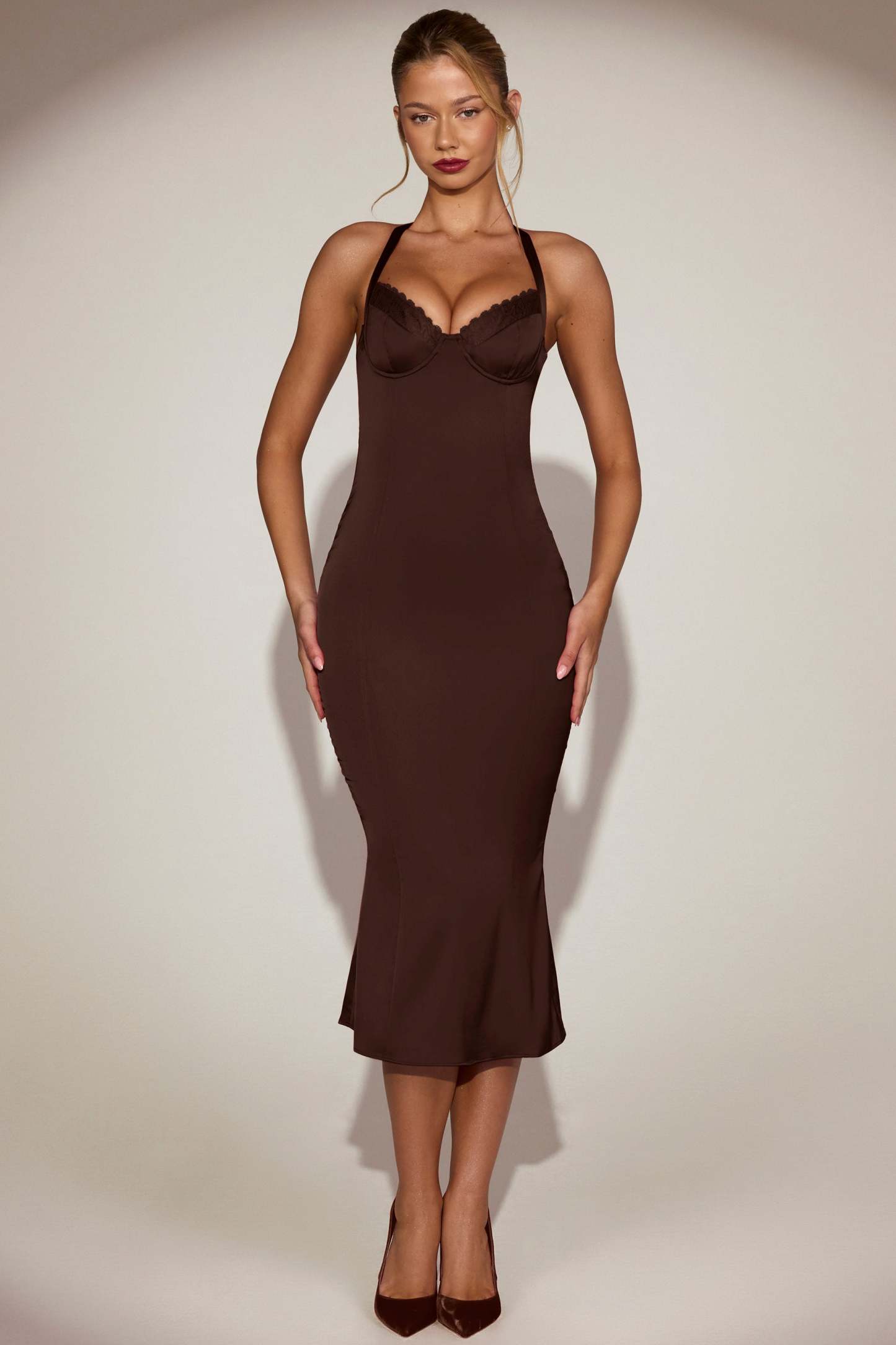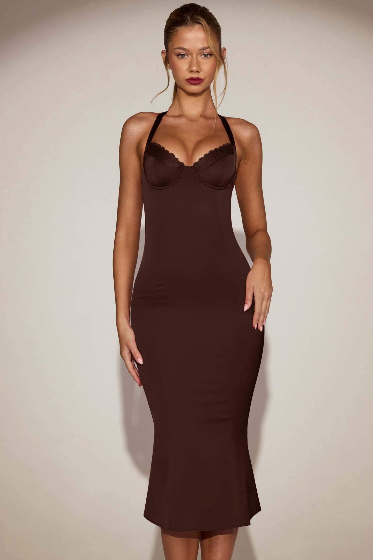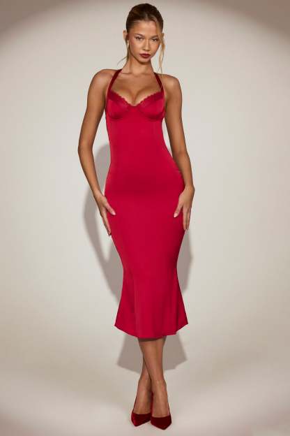 Step into effortless elegance with the Elyra midaxi dress. Crafted from premium satin in a flattering bodycon silhouette with a fluted fishtail hem, it skims the figure and flares subtly for graceful movement. Featuring a halterneck design with delicate lace trim and adjustable straps, it also has underwired cups for support and a flattering fit. Perfect for evenings that call for refined glamour, it’s a timeless addition to your wardrobe.