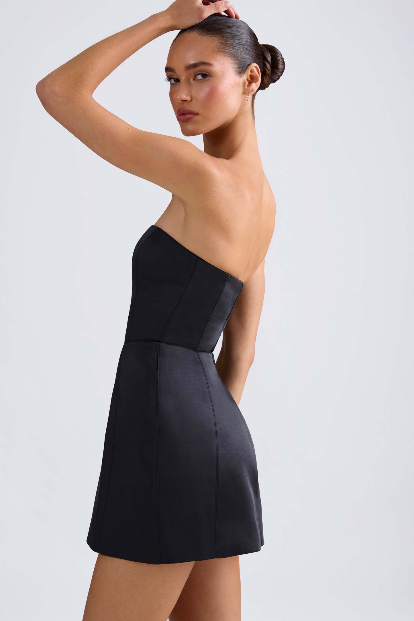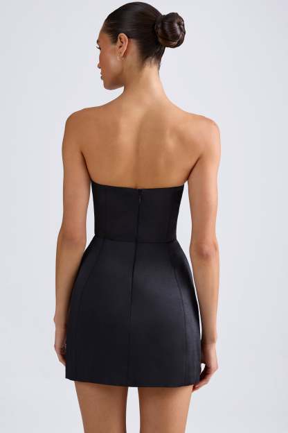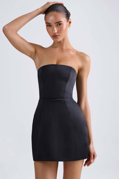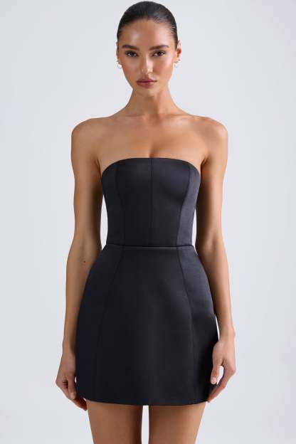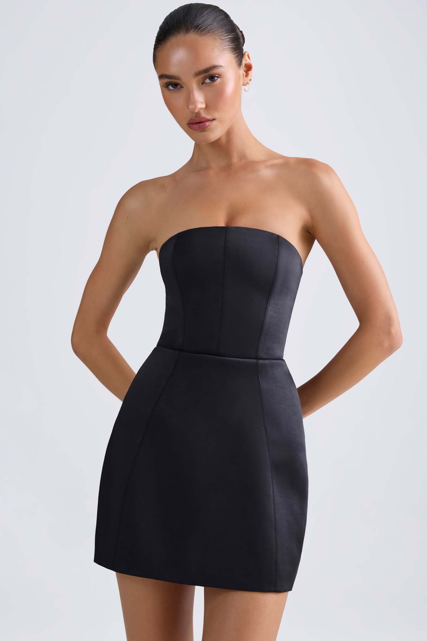 Classic minimalism with a structured twist. Modelled on classic styles, the Haisley mini dress is cut from recycled heavyweight satin to a shapely A-line silhouette that sculpts the waist and flares out at the hips. It features a built-in corset for enhanced shaping and support, as well as contouring seams that create an hourglass look.