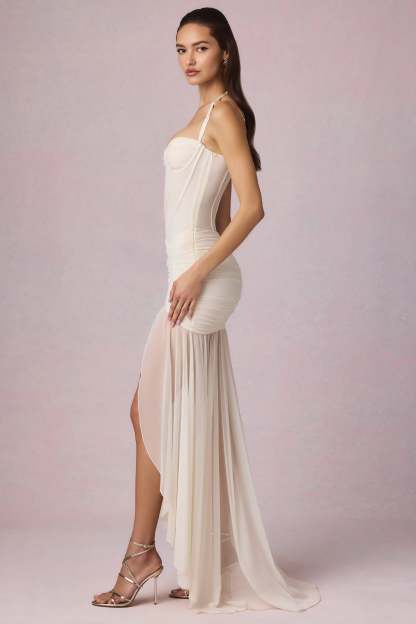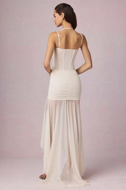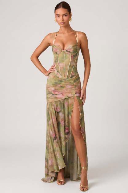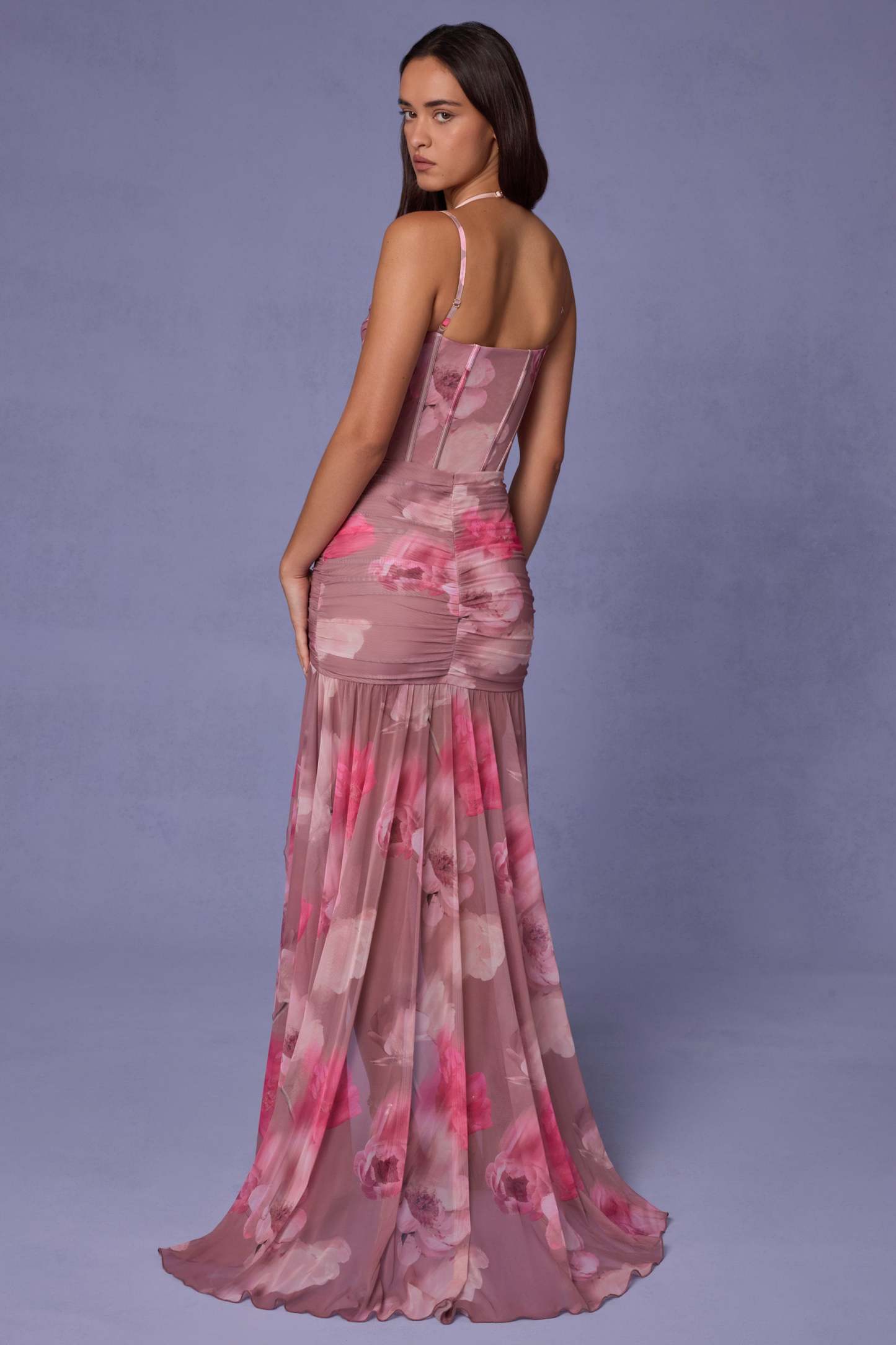 Divine elegance, exquisite craftsmanship. First seen on the runway, the Haruna gown is crafted from our premium, dual-layered floral mesh fabric that’s designed to skim and highlight your curves. It features a corset-inspired bodice, wired cups for enhanced support, and adjustable shoulder straps for a custom fit every time. It’s enhanced with ruched detailing at the waist and a partially lined handkerchief skirt with a small puddle train for a statement finish.