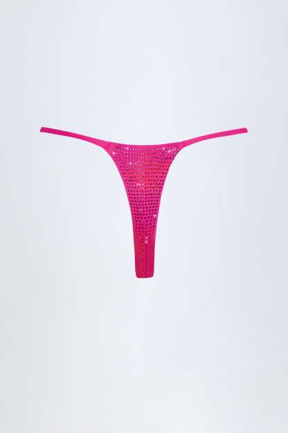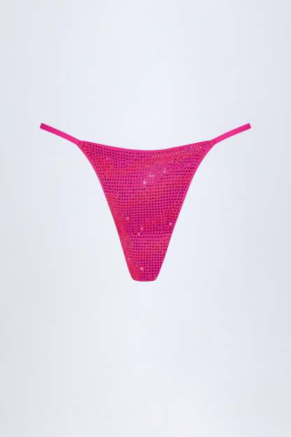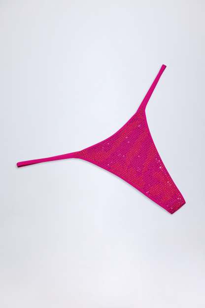 Embellished Thong Bikini Bottoms in Pink Tropical Print