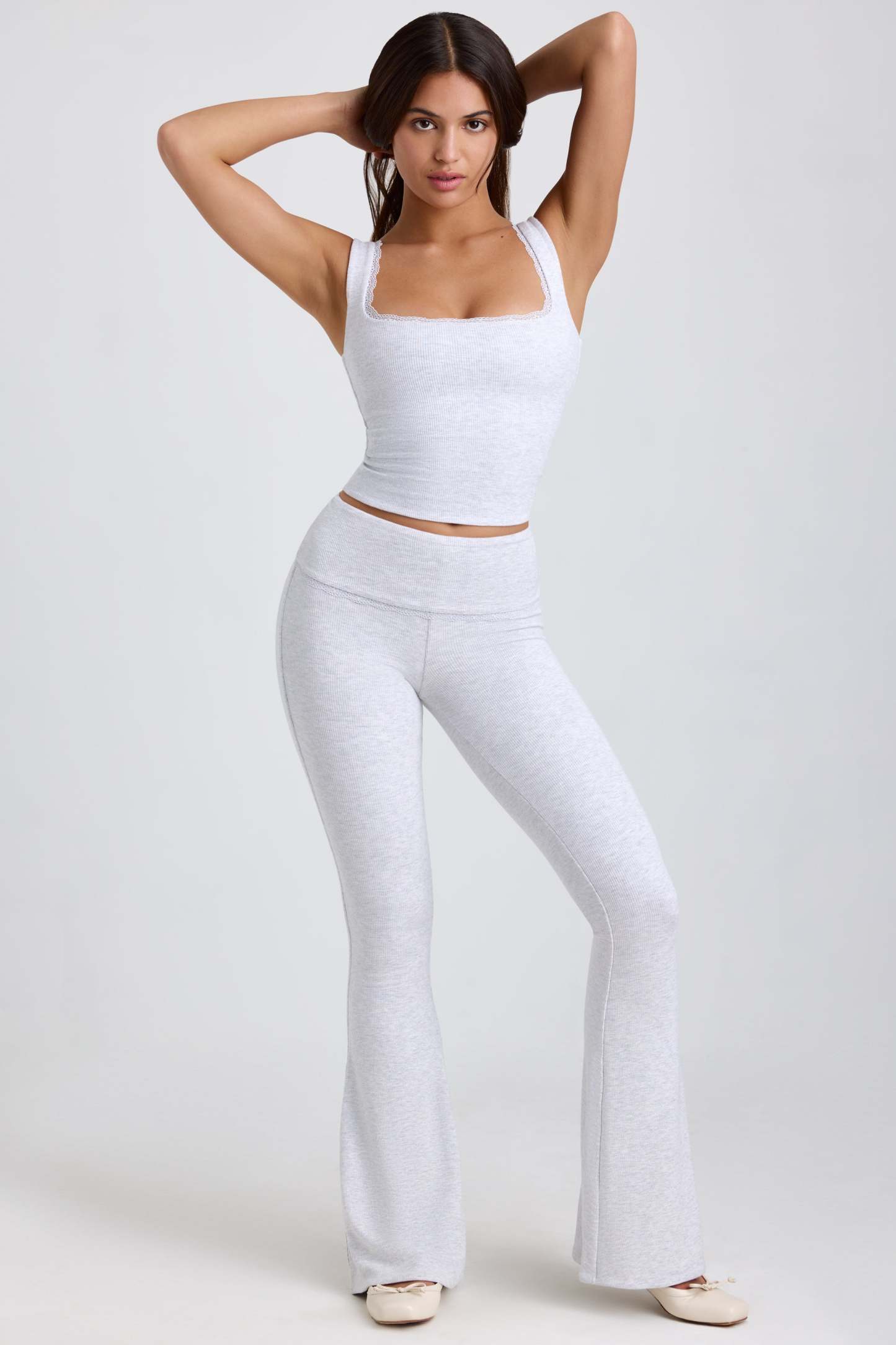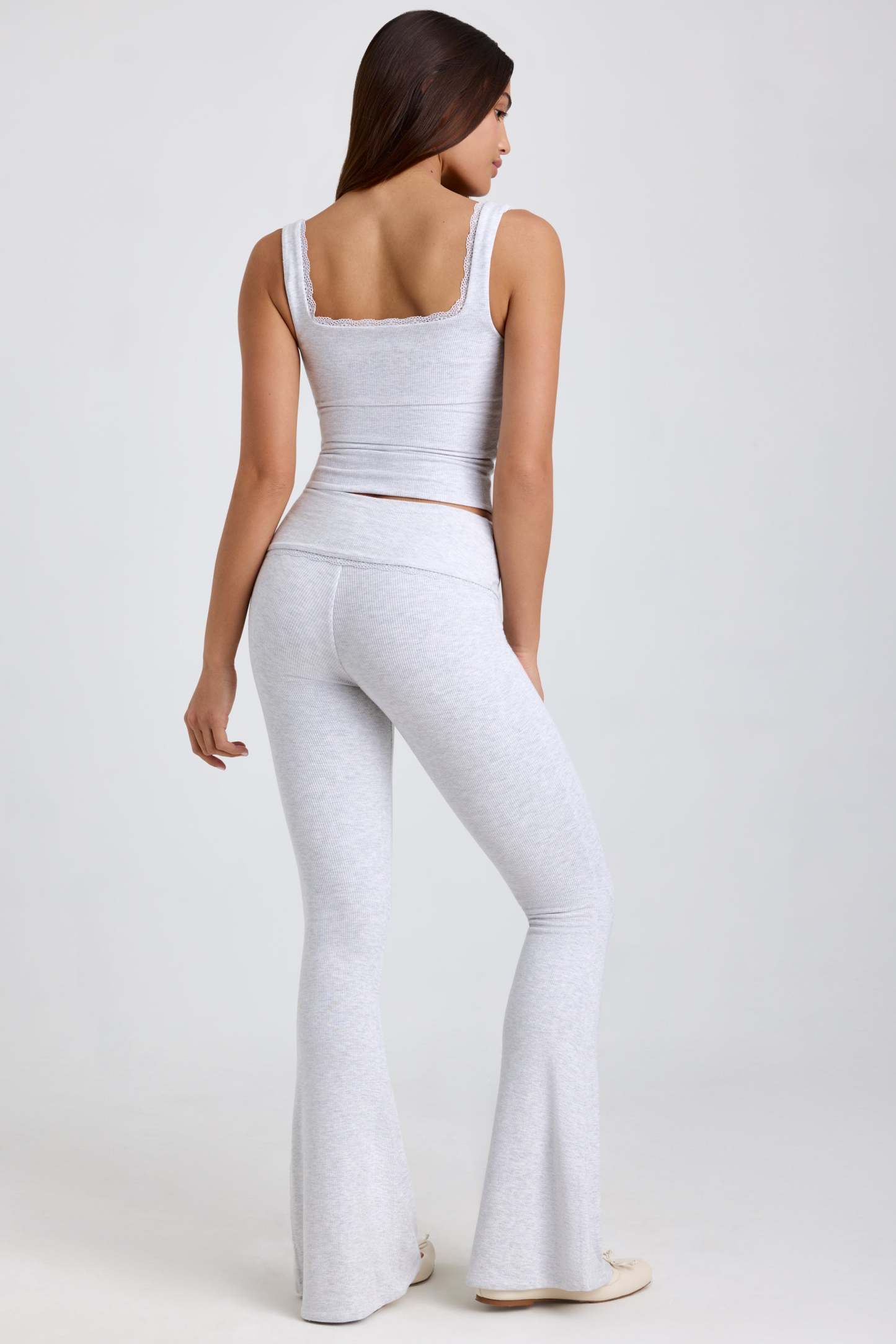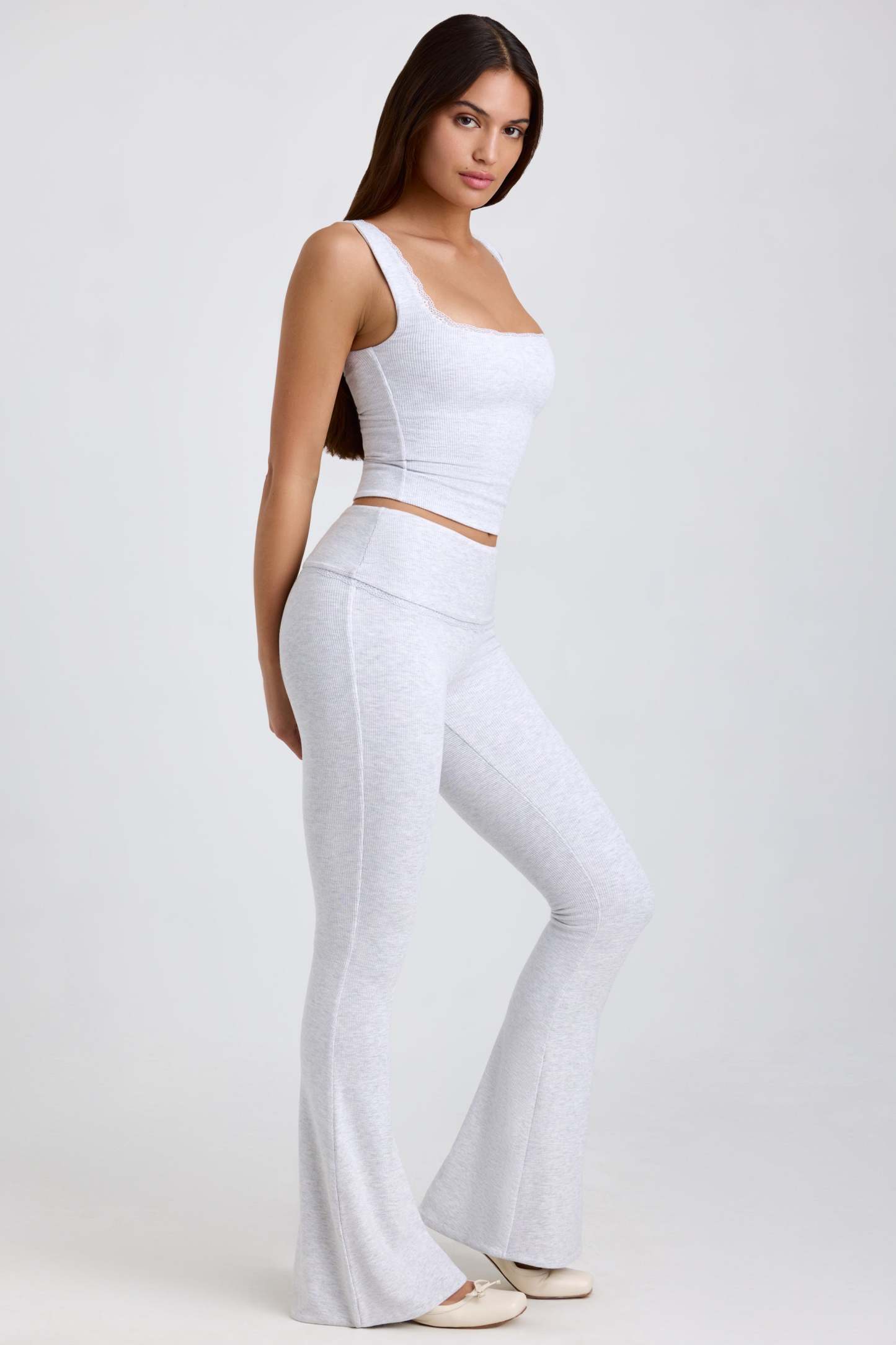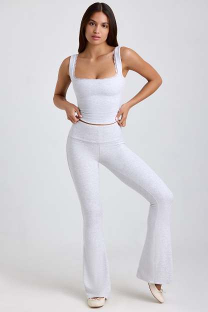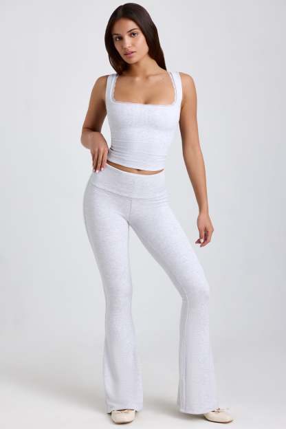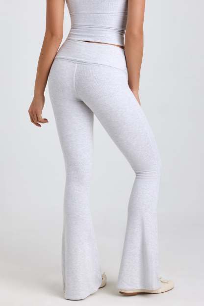 Ribbed Modal Mid-Rise Foldover Flared Trousers in Grey