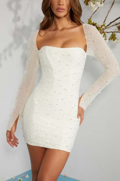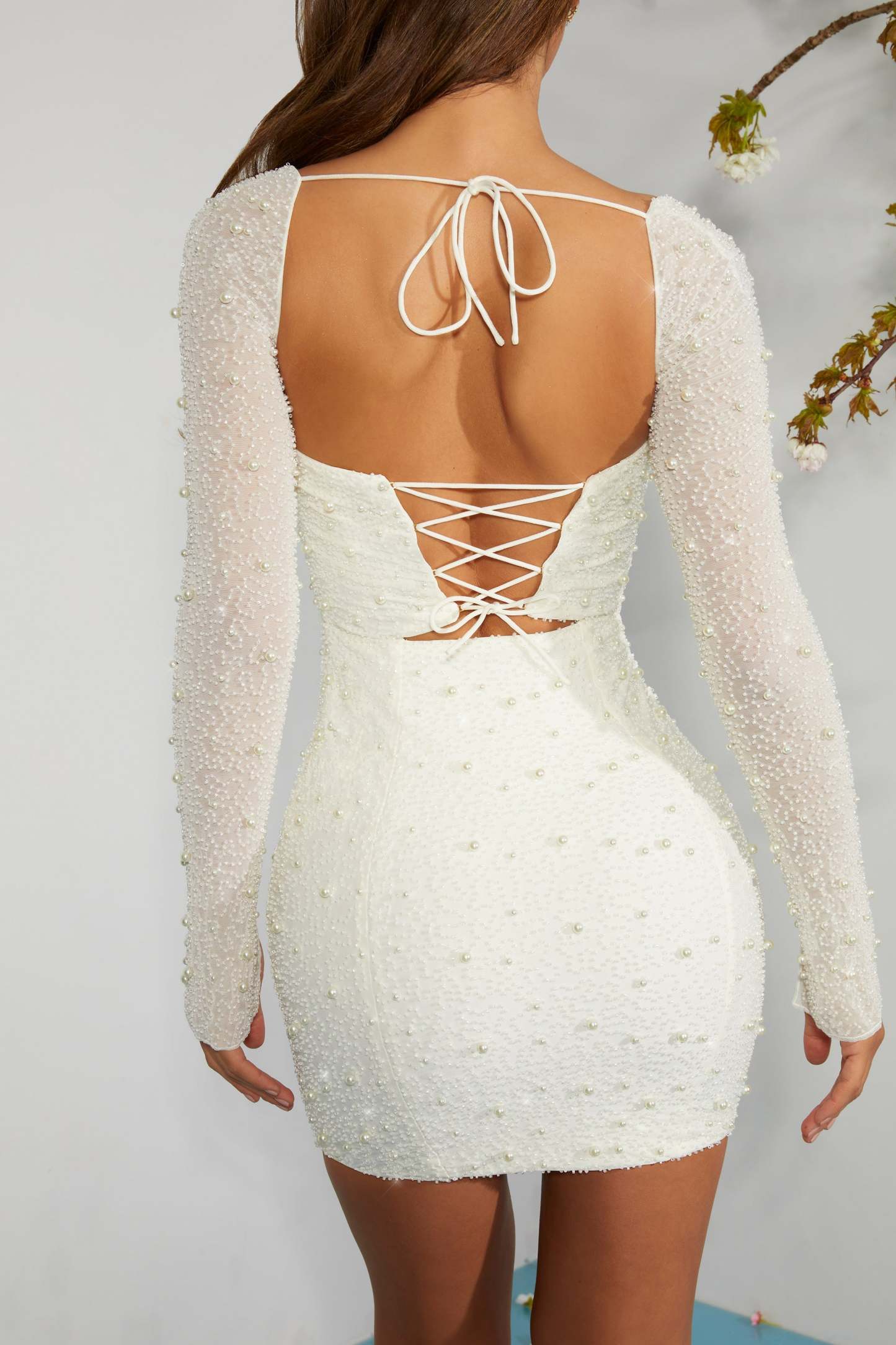 A bodycon fit, fully embellished and cut to a mini length, the Milan mini dress has everything you need to stand out at your next event. Designed in our fully embellished, dual lined mesh fabric with bead and pearl adornment, the Milan mini dress features a waist cinching corset and is tight cut to create an enhanced silhouette. Cut to a mini length with our signature, fully embellished single layer mesh sleeves, the Milan mini dress is complete with seductive lace up back detailing.