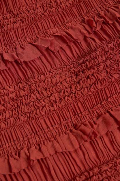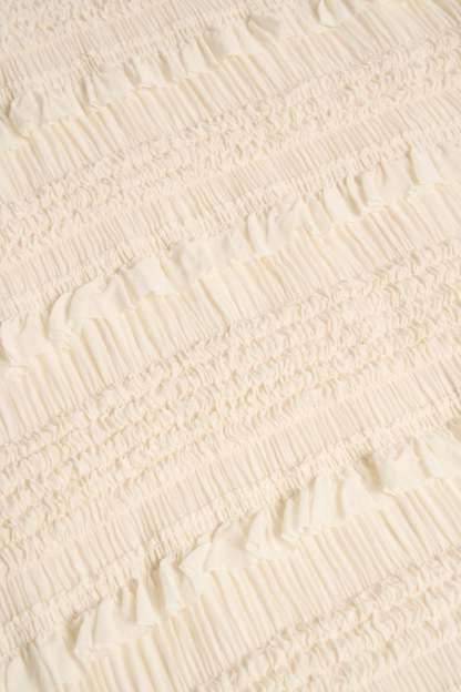 Made from premium, semi-sheer textured mesh with ruffle trims. Fully lined.
