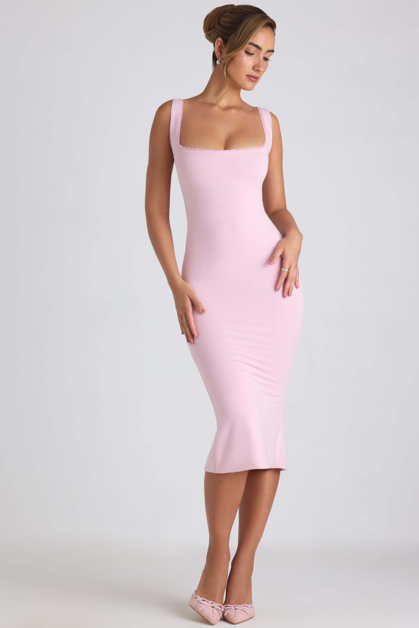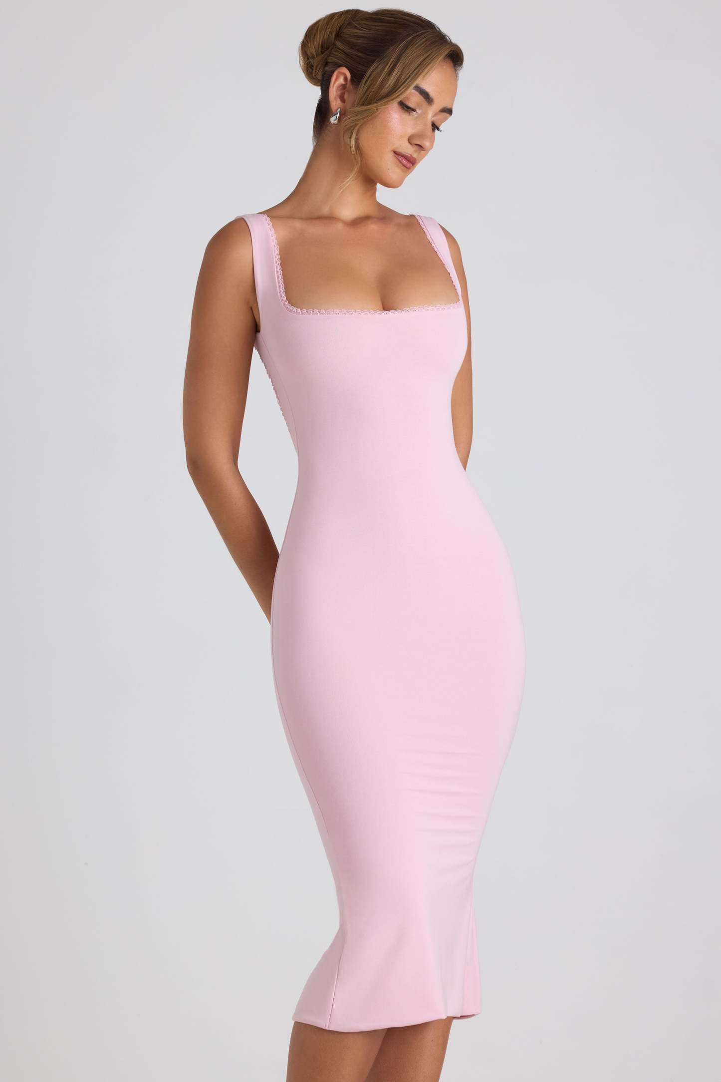 A wardrobe staple with a romantic twist. Available in three versatile hues, the Navi midaxi dress is crafted from buttery soft jersey made with TENCEL™ Modal – a fibre mainly manufactured from renewable beechwood, sourced from sustainable forests. It’s cut to a figure-enhancing bodycon fit with a fishtail hem, and features a round lace-trim neckline and sultry V-shaped low back with signature lace-up detailing.