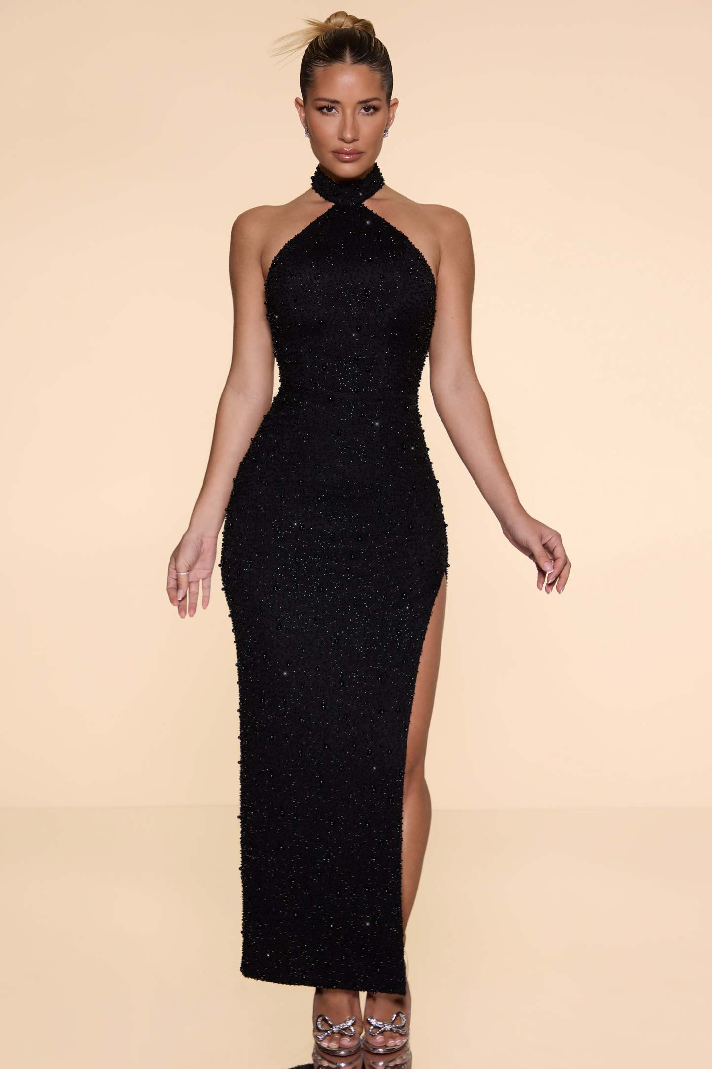 Embellished High Neck Split Maxi Dress in Black