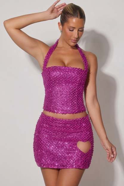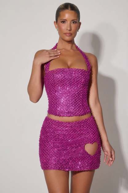 Iconic sparkle, limited-edition silhouettes. A style you won’t want to miss, the Querida skirt is crafted from our premium glittered mesh fabric with bead embellishments for maximum sparkle. Lined in soft jersey, it’s cut to a micro mini A-line silhouette, designed to sit low on the waist and features a unique heart-shaped cut-out at the front, cementing the romantic mood.
