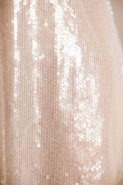 • Unlined power mesh fabric with all over flat sequin overlay and raw edge hem