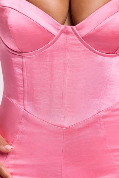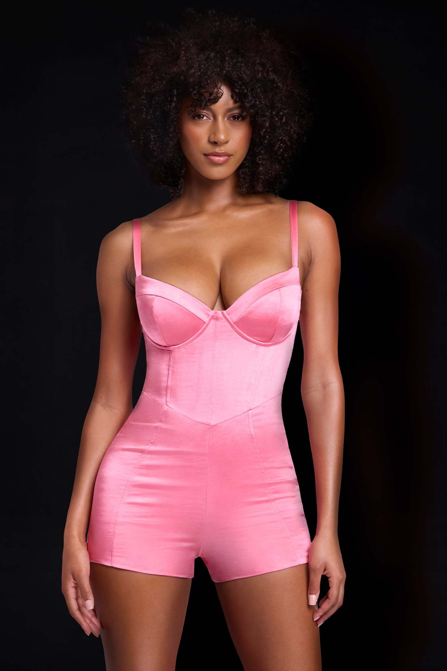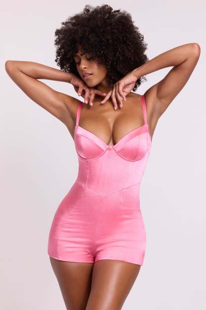 Effortless seduction. Designed in our high shine satin fabric and cut to a curve-enhancing bodycon fit, the Romera playsuit is perfect for sultry evenings. A fun and flirty silhouette, Romera is complete with underwired cups, a cheeky length and figure-cinching built-in corsetry.