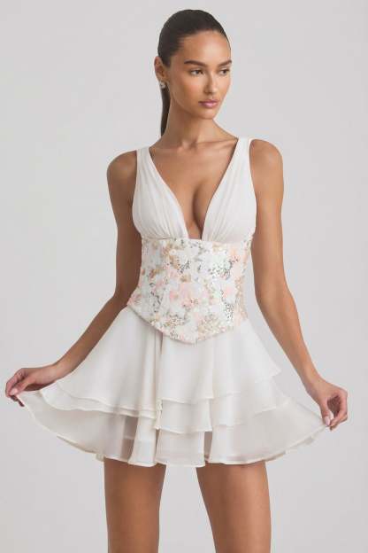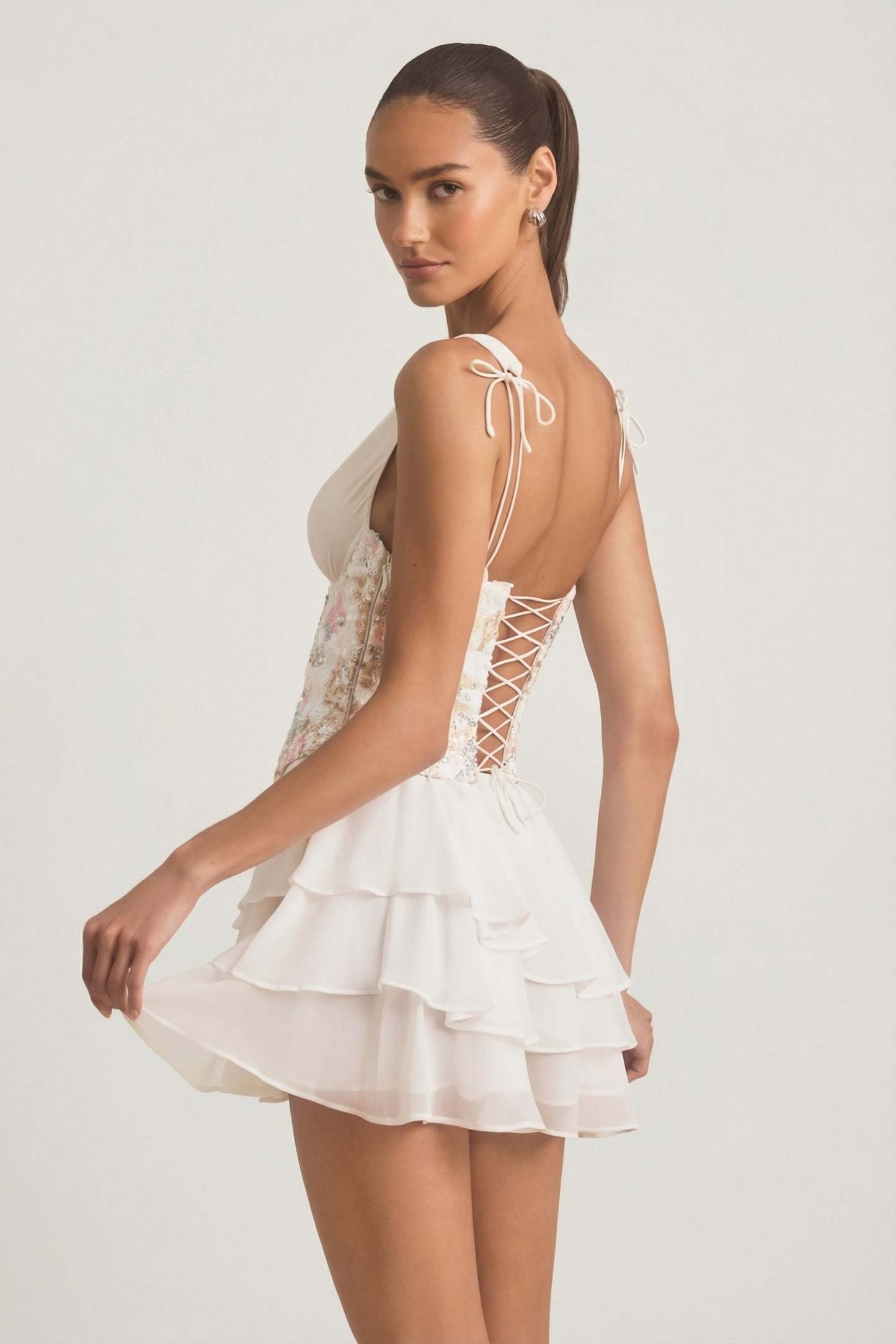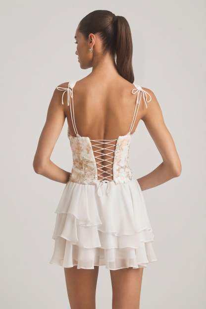 Pretty florals meet unique construction with the Sakura mini dress. Crafted from layers of lightweight chiffon with a plunging neckline and dynamic tiered skirt, it’s overlaid with a waist-cinching corset crafted from mesh and decorated with custom floral appliqués and sparkling embellishments that coordinate perfectly. It’s complete with a signature lace-up back and adjustable rouleau straps for a custom fit.