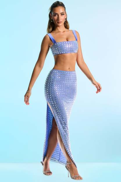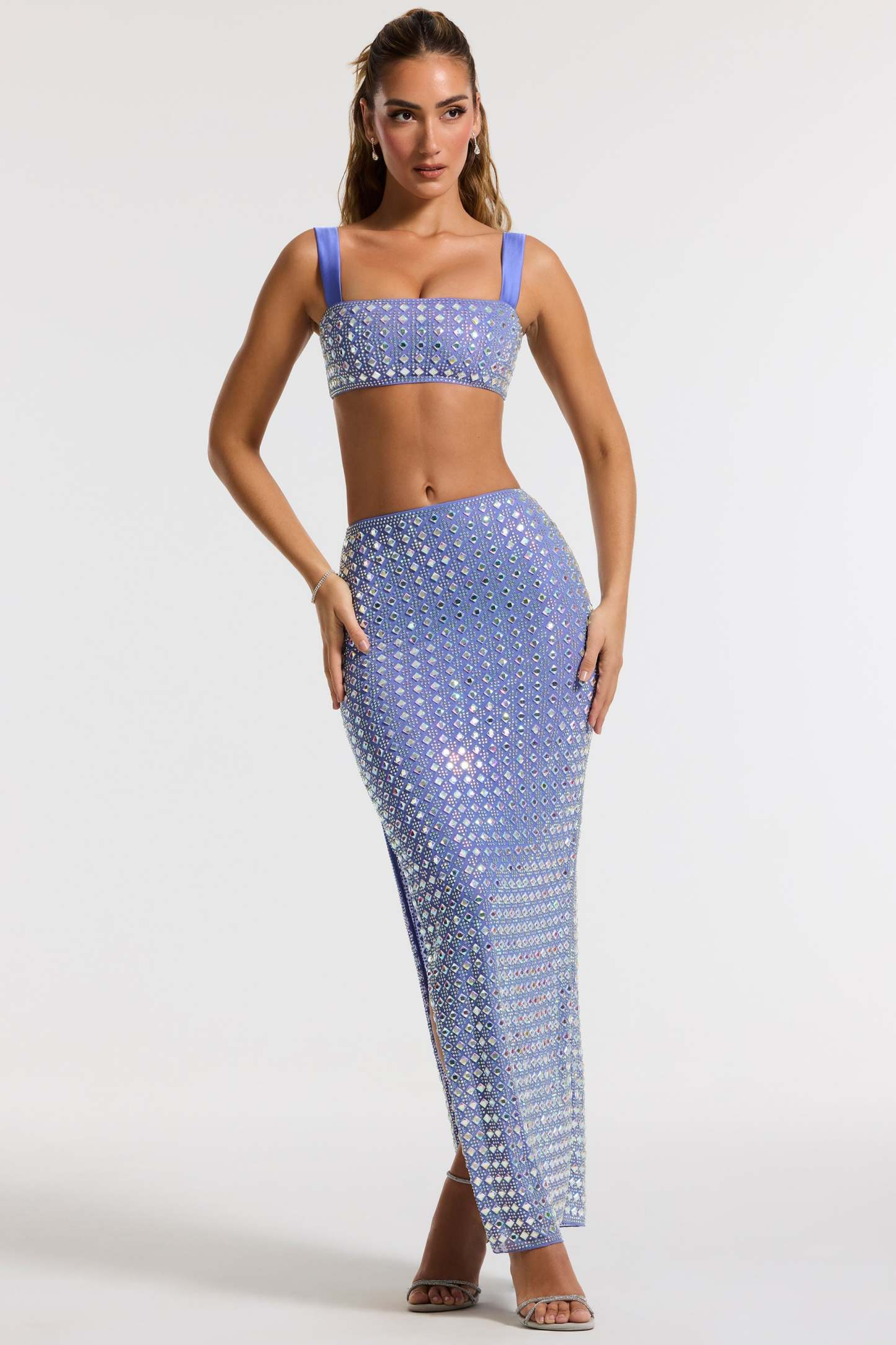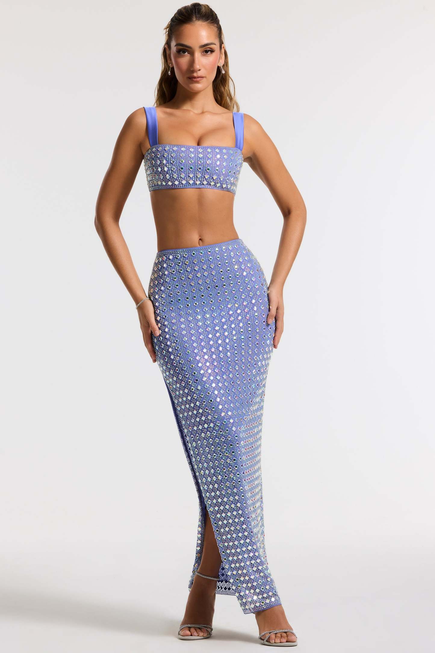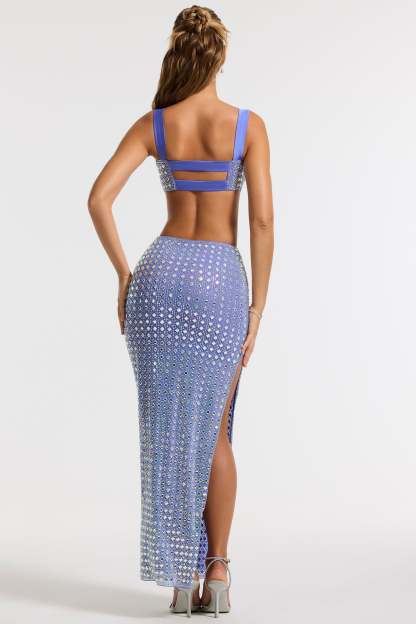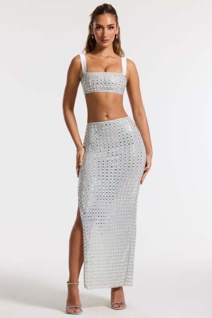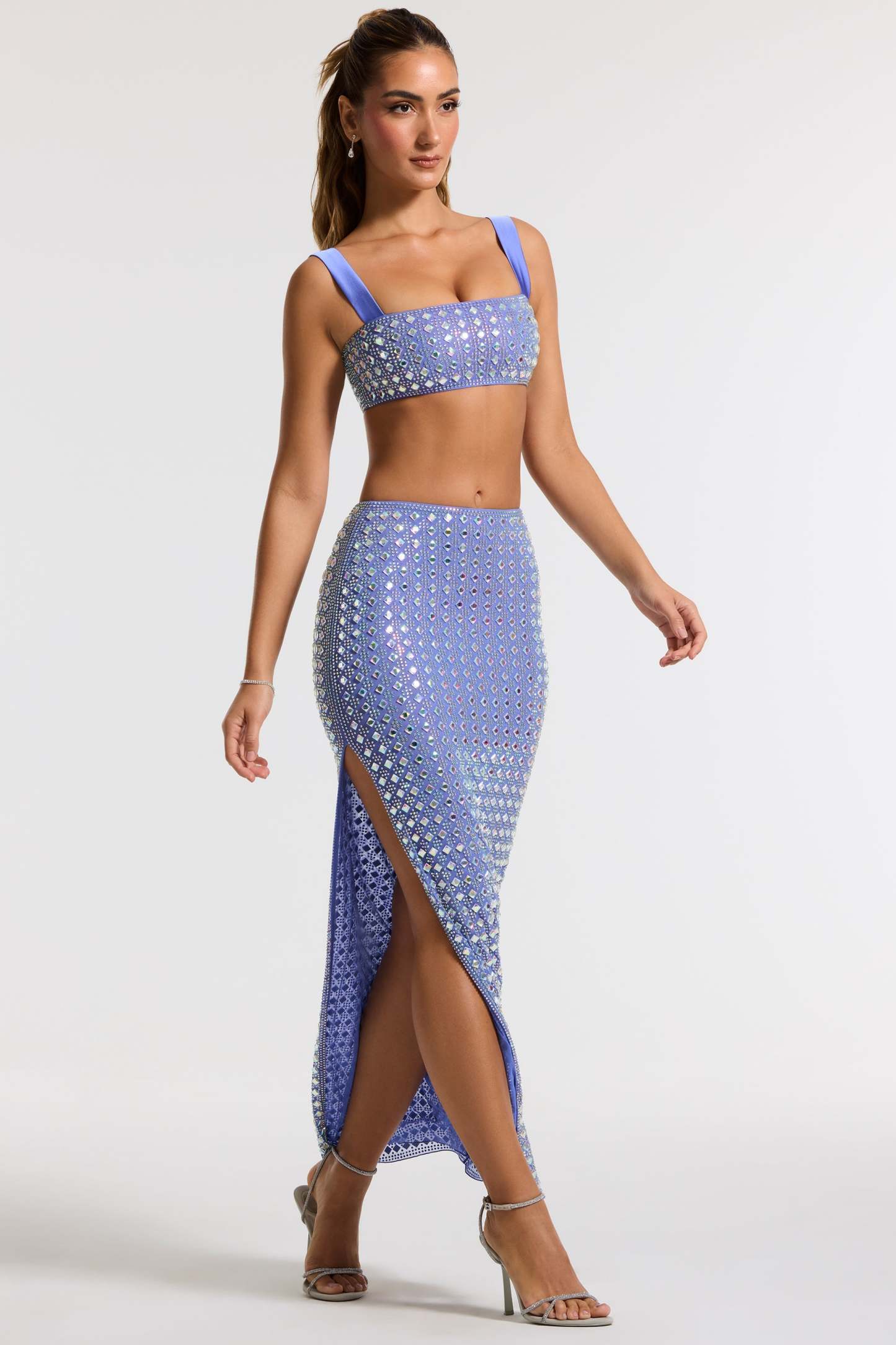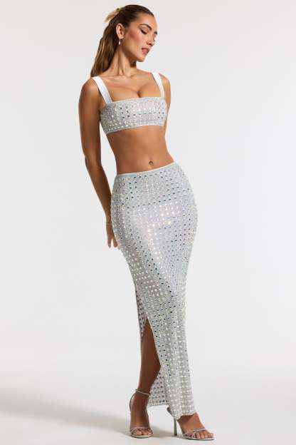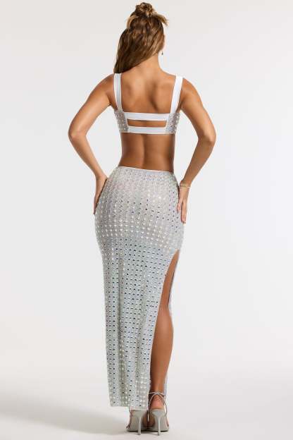 An elegant, mid-rise maxi-length skirt designed for opulent moments. Created in our premium stretch mesh fabric with delicate hand-embellishments throughout, the Siona column maxi skirt features a dramatic thigh-high side split and was made to be paired with our Asani square neck top.