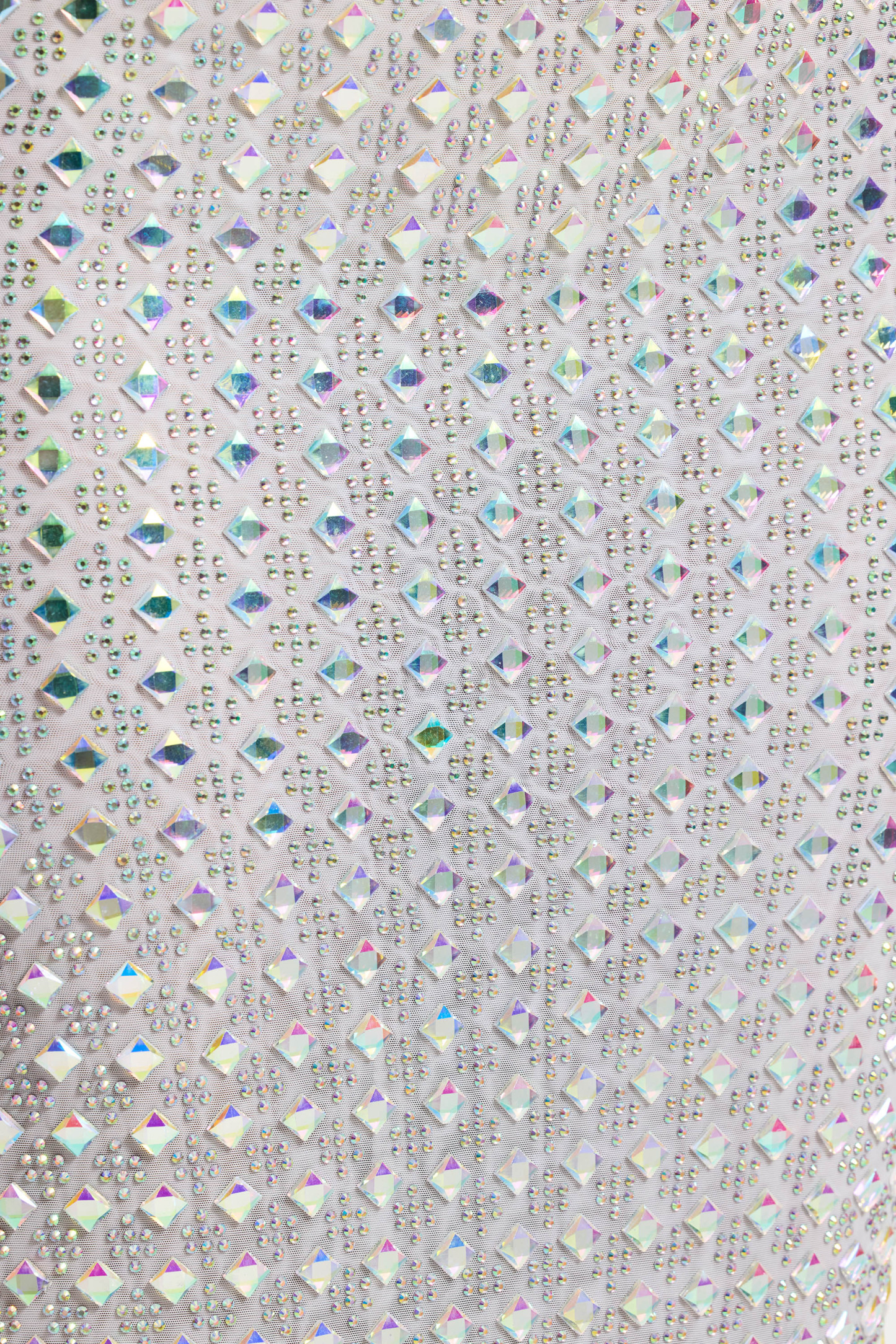 Premium dual layered, stretch mesh fabric with hotfix embellishment (85% Polyester, 15% Elastane). This garment contains delicate artisanal hand embellishment, and it is normal that overtime embellishment may become loose. Additional embellishment has been provided for repairs.