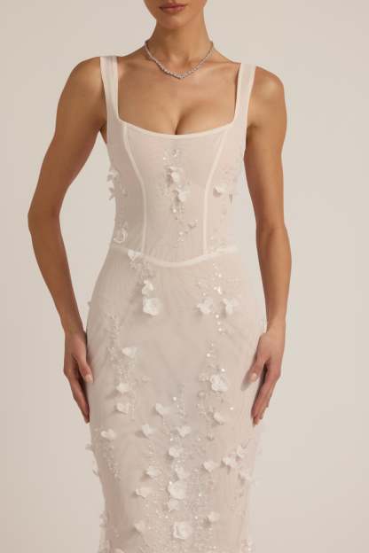 Wearable works of art for your most special occasions, the Vasanta gown is adorned with delicate tonal floral appliqués brought to life with perfectly placed sequin embellishments. It’s crafted from lightweight, semi-sheer premium mesh that hugs your curves and is lined with signature power mesh for a non-restrictive sculpting effect. It’s cut to a classic fishtail silhouette with lace-up detailing at the back and adjustable straps for your perfect level of support.