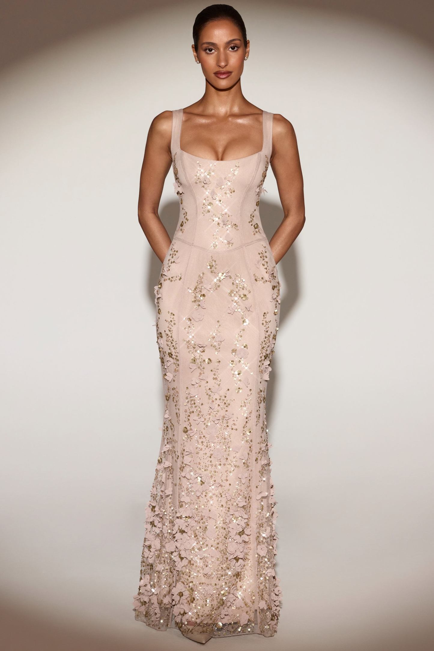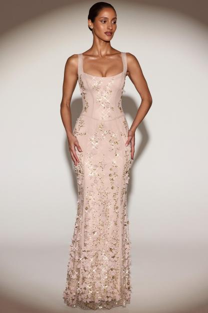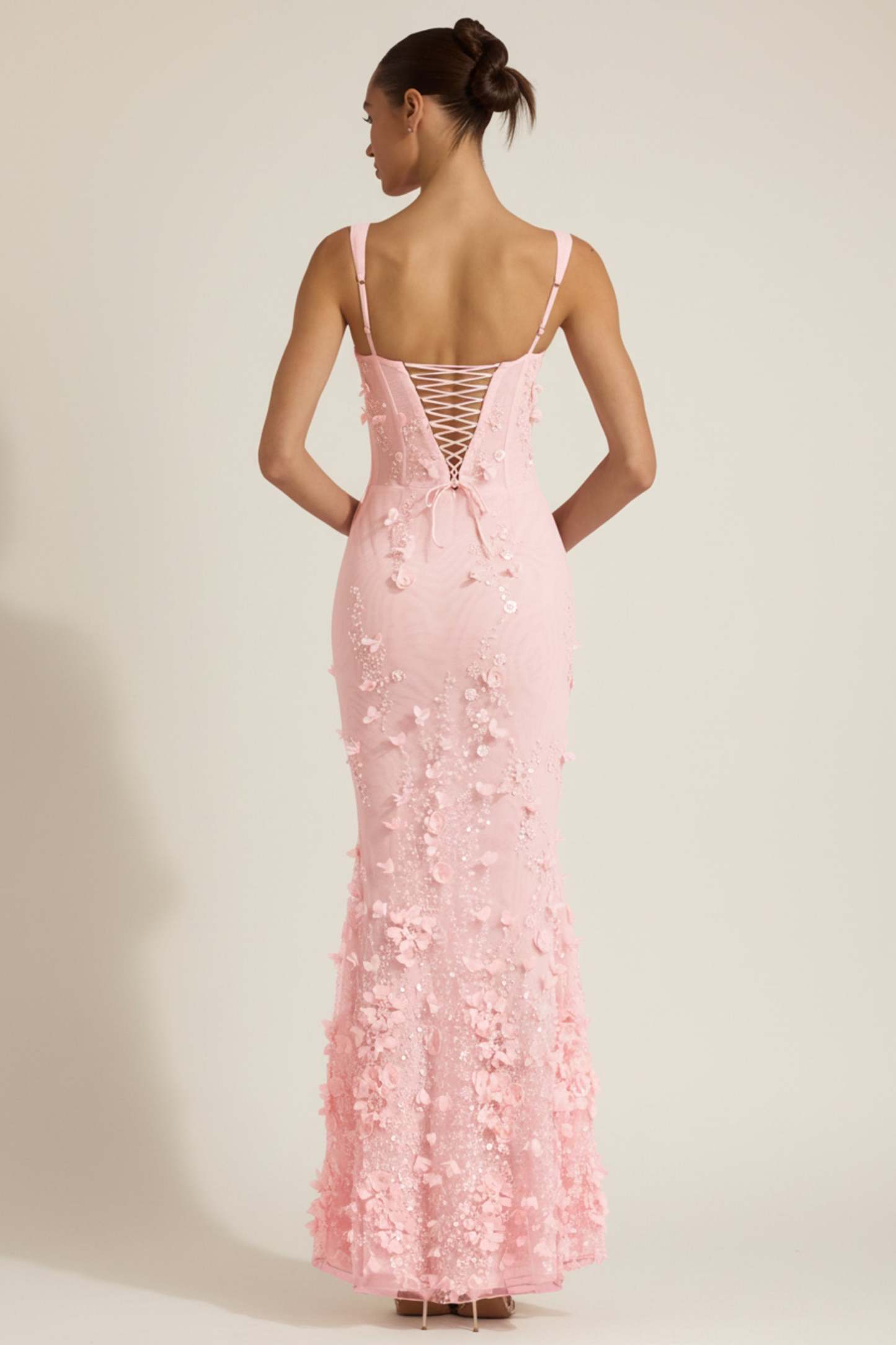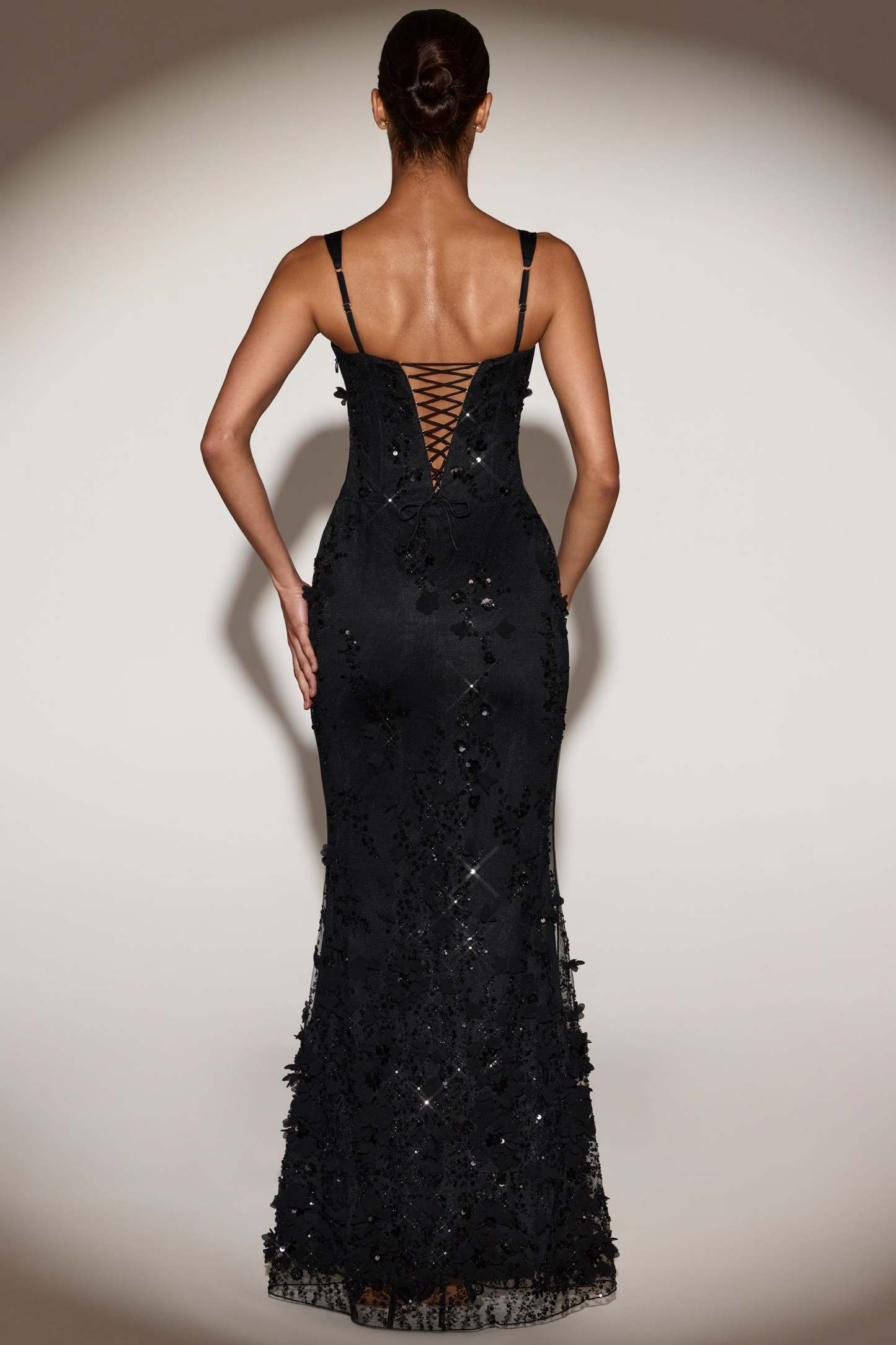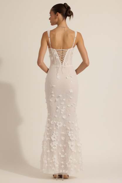 Wearable works of art for your most special occasions, the Vasanta gown is adorned with delicate tonal floral appliqués brought to life with perfectly placed sequin embellishments. It’s crafted from lightweight, premium mesh that hugs your curves and is lined with jersey for a non-restrictive sculpting effect. It’s cut to a classic fishtail silhouette with lace-up detailing at the back and adjustable straps for your perfect level of support.