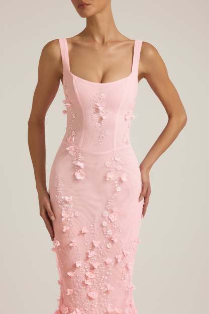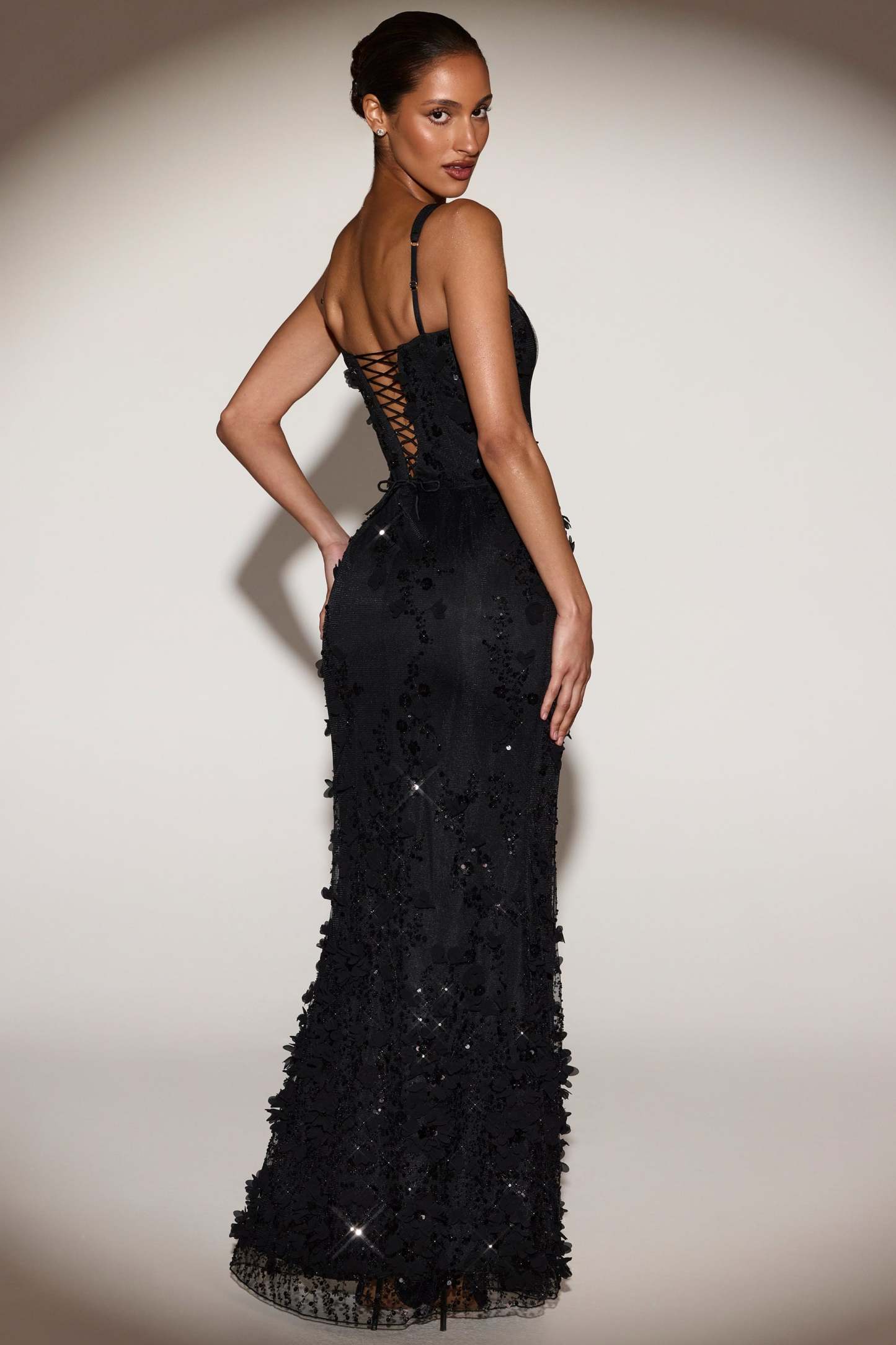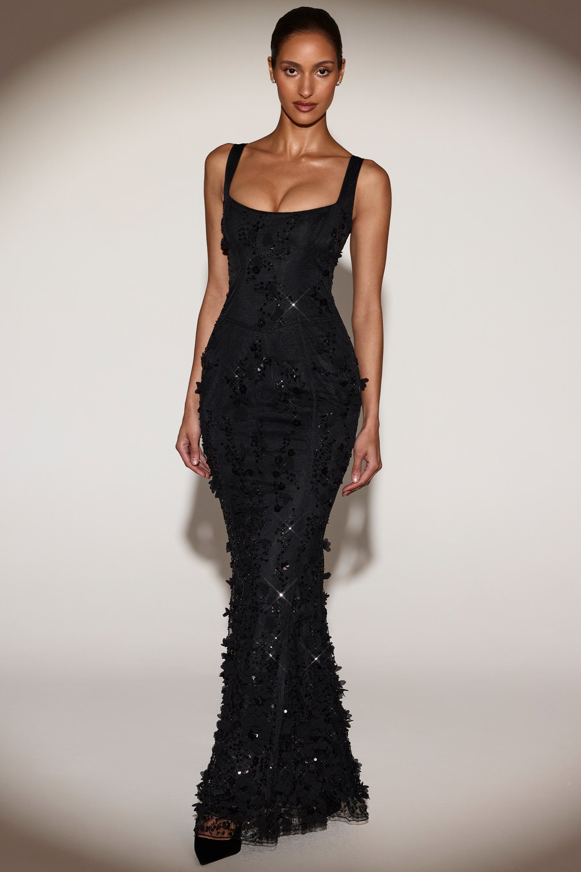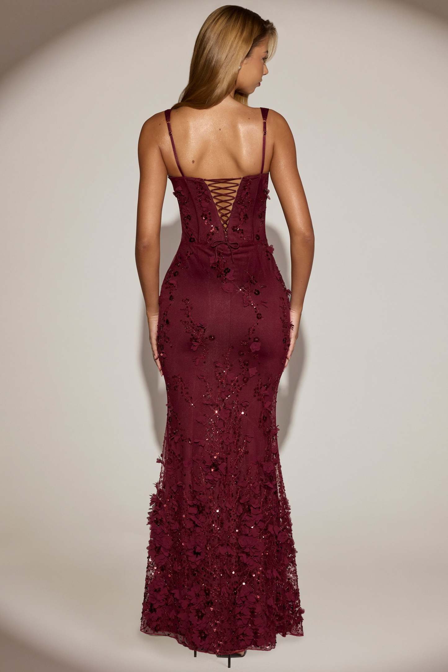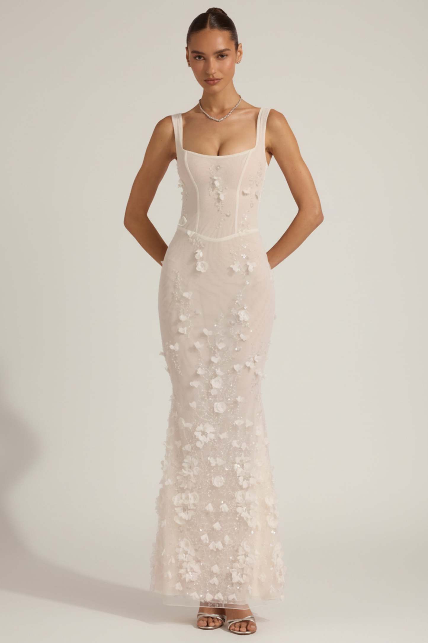 Wearable works of art for your most special occasions, the Vasanta gown is adorned with delicate tonal floral appliqués brought to life with perfectly placed sequin embellishments. It’s crafted from lightweight, premium mesh that hugs your curves and is lined with jersey for a non-restrictive sculpting effect. It’s cut to a classic fishtail silhouette with lace-up detailing at the back and adjustable straps for your perfect level of support.