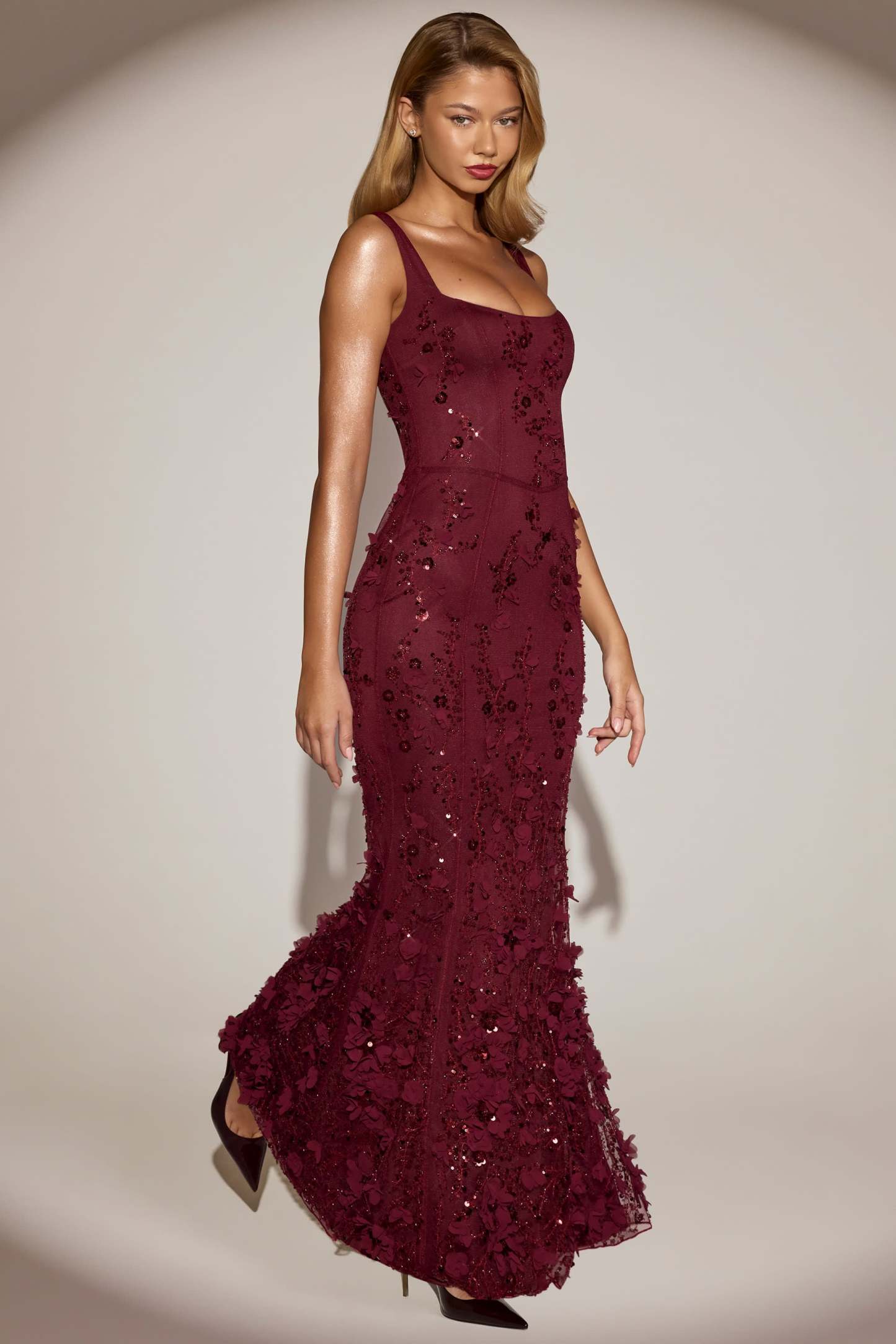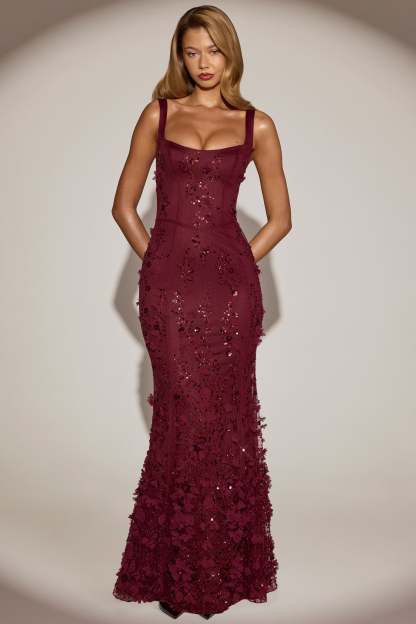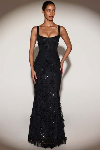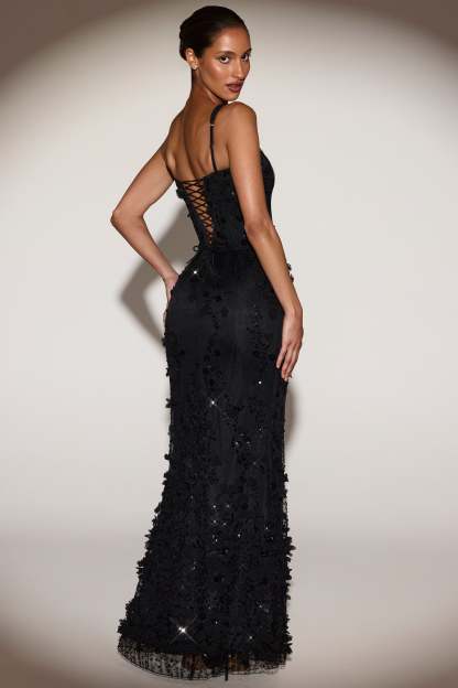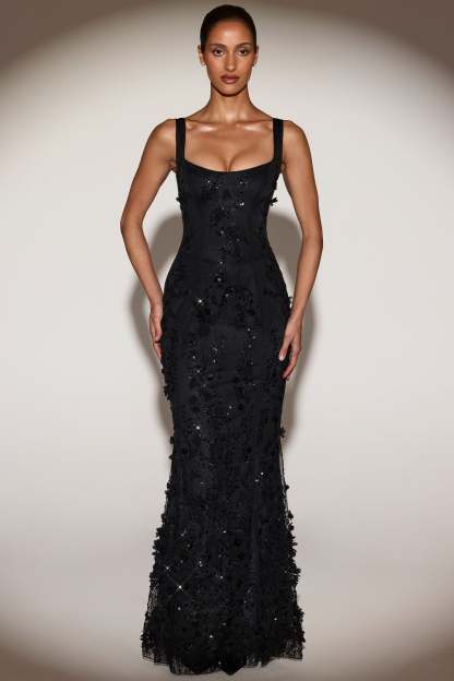 • All-over custom floral appliqués and sequin embellishment