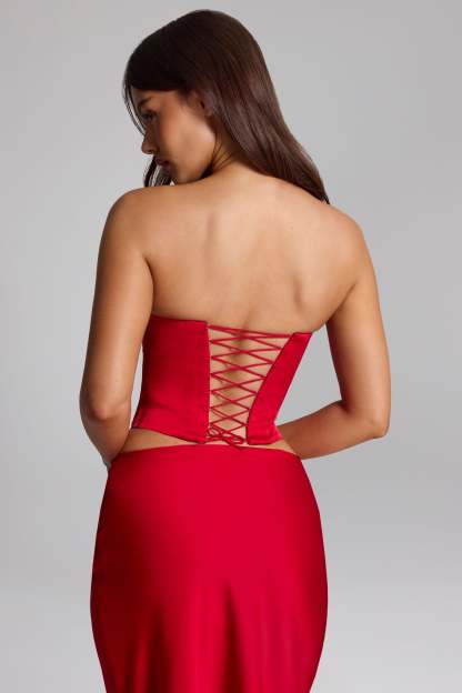 All eyes on you. Vampy and glamorous, the Xandi corset top is modelled on classic lingerie-inspired styles. Cut from lustrous satin, it features built-in boning for a supportive fit and a signature adjustable lace-up back for your perfect fit every time. The curved neckline and hem nod to our femme fatale inspiration for the season.