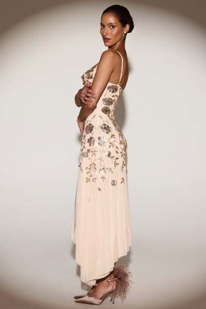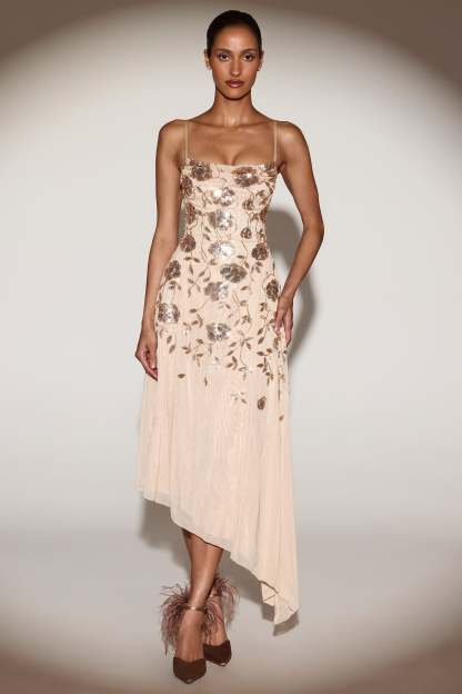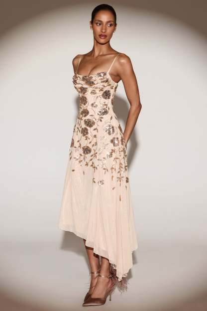 Step into the spotlight with the Zelina midi dress. Designed with a feminine neckline with a soft cowl overlay, it’s crafted from our premium embellished fabric with floral sequins that shimmer with every move. Finished with adjustable straps, a concealed zip-side fastening, with a flattering asymmetric hem.